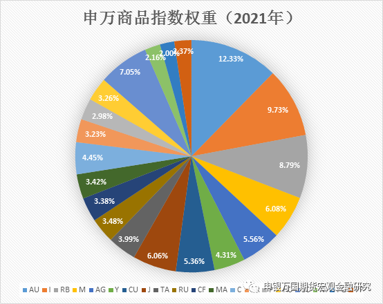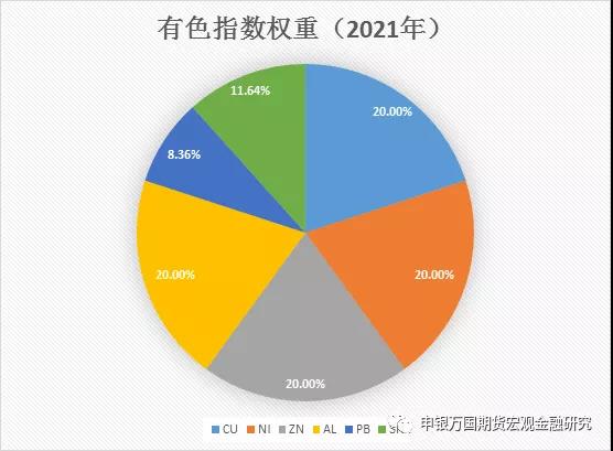根据申万期货商品指数编制方案的计算原则,在2021年的品种权重计算结果中,申万期货商品指数剔除了AL、ZN两个品种,新加入SC、FG两个品种;工业品指数剔除V,新增FU、SP两个品种;黑色指数新增SS品种;能化指数新增NR、UR品种;农产品指数新增RR品种;有色指数包含品种保持不变。